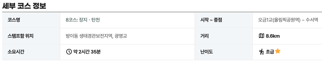 서울둘레길 8코스는 오금교에서 수서역까지 이어지는 8.6km 구간입니다. '자연생태가 복원된 도시 하천길'이라는 테마로, 도심 속 생태하천을 따라 걸으며 도시와 자연이 어우러진 풍경을 감상할 수 있습니다.